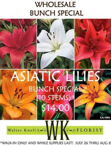 Through August 8th, Walter Knoll Florist is offering wholesale Asiatic Lily Bunches