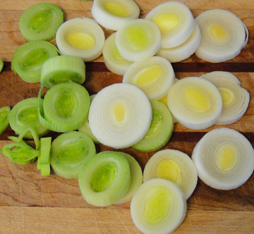 Slice leeks and shallots into 1/4 inch coin shapes