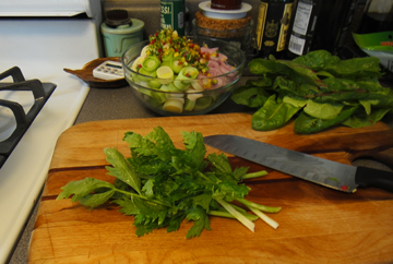 Heat a tablespoon or two of olive oil in a Dutch oven or soup pot. Sauté the diced leeks, shallots, chard stems, celery, jalapeno and minced garlic on medium low for 15 or so minutes until soft and translucent, do not brown.
