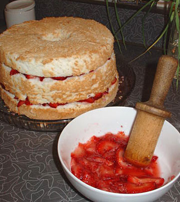 I have connected with my cousin Lynette on Facebook and she asked me lately if I had Grandma’s angel food cake with strawberry glaze recipe. Every birthday growing up my Grandma Boerschig would make whatever cake we requested for our birthday. Often I went for the pineapple upside down cake make in an iron skillet, but more often I went for her Angel Food Cake with a hardened strawberry glaze. Sometimes she made a homemade Angel Food Cake and sometimes she used a box mix. You could tell if she used a box by the colored speckles in the cake! I remember her teaching me how to make the glaze once, with a tin of frozen sliced strawberries, but for the life of me I am not sure if she used egg white or egg yolk. This cake I made with a yolk, and except for it it being made with fresh berries and not hardening because I put it on so thick, I think this glaze is dang good!