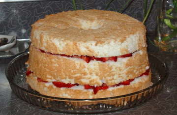I have connected with my cousin Lynette on Facebook and she asked me lately if I had Grandma’s angel food cake with strawberry glaze recipe. Every birthday growing up my Grandma Boerschig would make whatever cake we requested for our birthday. Often I went for the pineapple upside down cake make in an iron skillet, but more often I went for her Angel Food Cake with a hardened strawberry glaze. Sometimes she made a homemade Angel Food Cake and sometimes she used a box mix. You could tell if she used a box by the colored speckles in the cake! I remember her teaching me how to make the glaze once, with a tin of frozen sliced strawberries, but for the life of me I am not sure if she used egg white or egg yolk. This cake I made with a yolk, and except for it it being made with fresh berries and not hardening because I put it on so thick, I think this glaze is dang good!