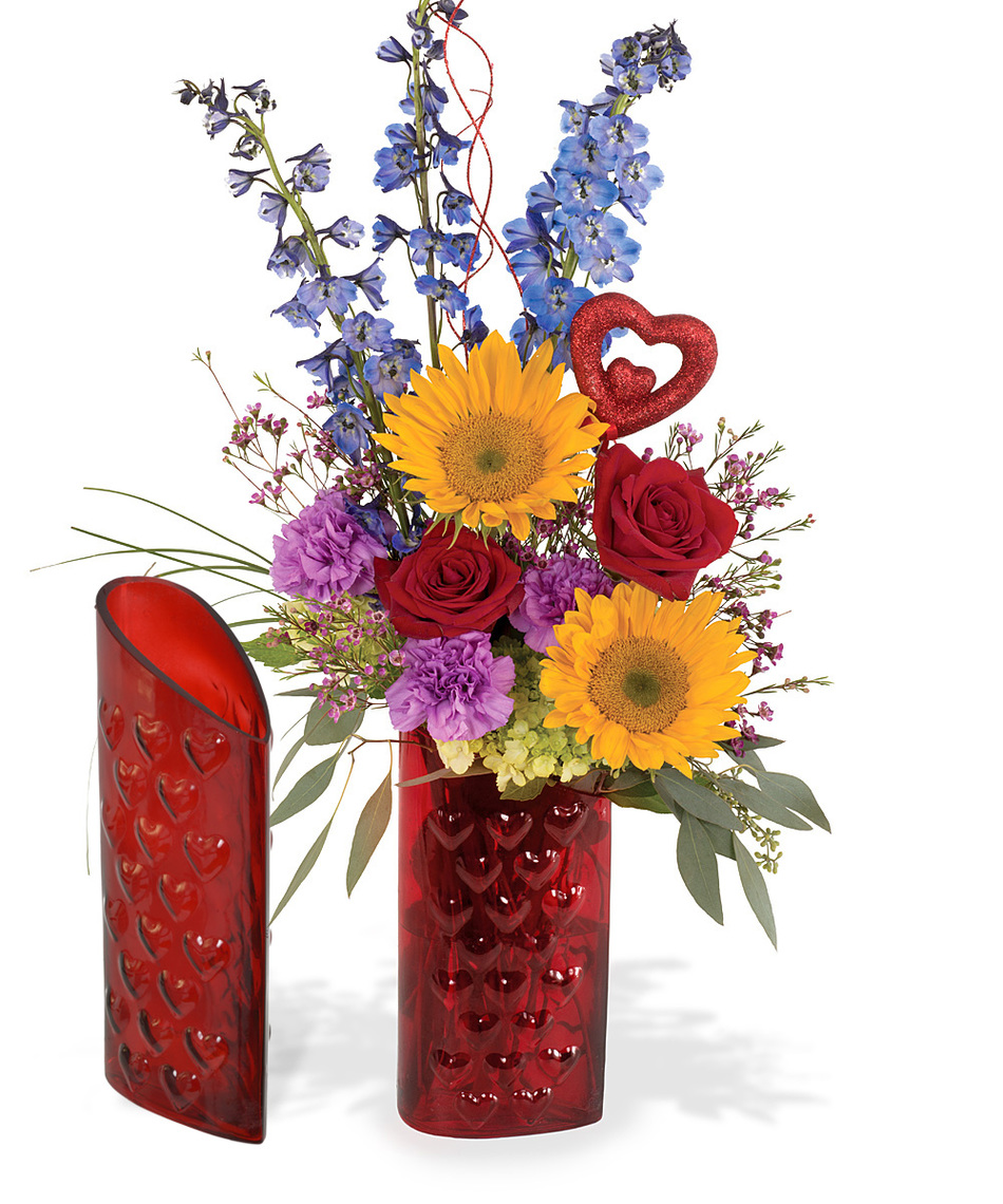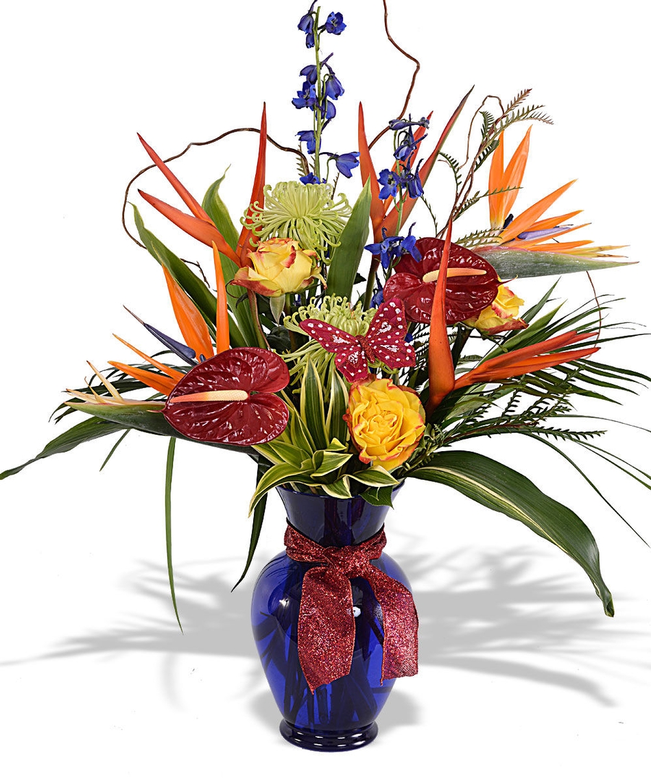 Tropical blooms can evoke the passion and fire that you feel for your loved one this Valentine’s Day. Some of the top tropical flower choices include the orchid, bird of paradise and the lily — or combine a variety of tropical flower choices in the Warm Love arrangement, which can include these blooms along with green Fuji, delphinium, assorted greens and roses all beautifully displayed in a cobalt blue vase accented with a butterfly and red glitter ribbon. This bouquet is available in small and large sizes.