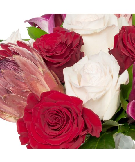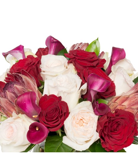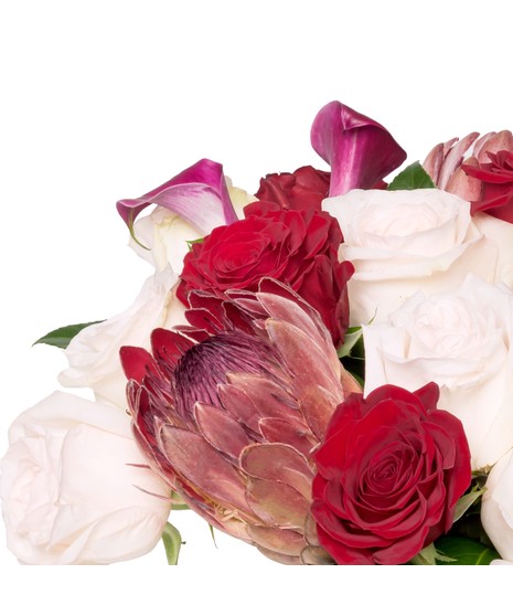 Adore You presents a romantic blend of premium florals, featuring striking Pink Mink Protea from South Africa in a bold burgundy hue, Blush O'Hara garden roses exuding a sweet fragrance, vibrant red standard roses, and classic plum calla lilies. This stunning piece offers a unique yet timeless beauty, perfect for an effortless expression of romance.