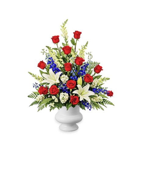 A Patriotic Side Piece for Head or Foot of Casket Dark blue delphiniums, red roses, white stock, white snapdragons, white lilies, red ti leaves, fern, salal, eucalyptus and myrtle.