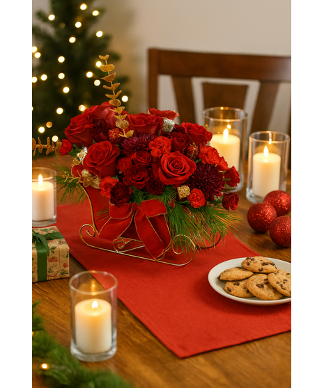Make your holidays shine with Sleigh the Season, a bold and festive centerpiece that blends classic holiday luxury with a modern, trend-forward twist. This show-stopping sleigh overflows with lush red roses, rich burgundy mums, and velvety carnations, accented by shimmering gold touches, pine greenery, and a perfectly tied velvet bow.