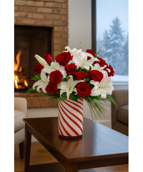 Bring timeless elegance to the holiday season with Snow Lilies, a radiant winter floral design that captures the beauty of the holidays in pure white and deep red. Classic red roses pair perfectly with snowy white lilies, all nestled among lush winter greens in a striking peppermint-striped vase — a nod to the sweetness of the season.