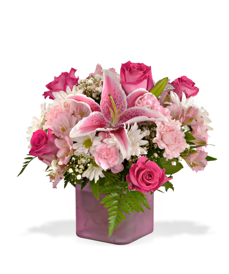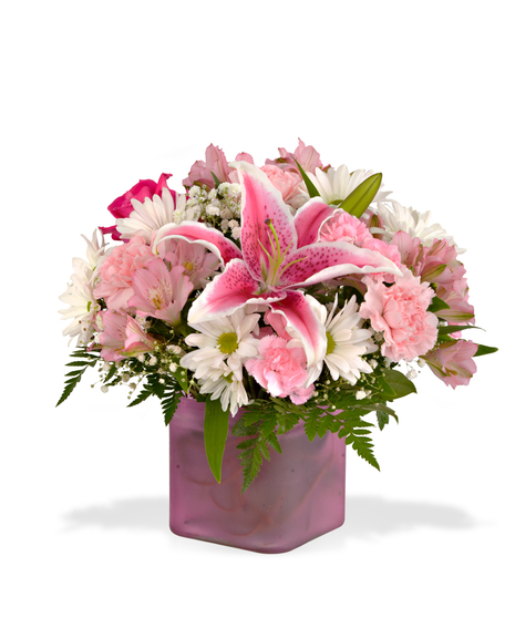 5" frosted cube with DAISIES, pink CARNATIONS , pink ALSTROEMERIA, starglazer LILY and pink ROSES.